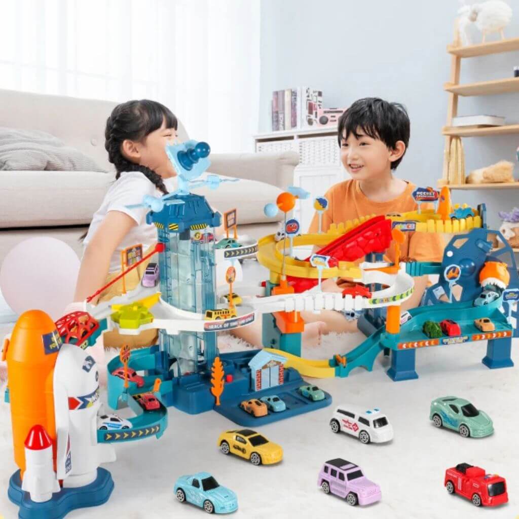 Com duas opções emocionantes, os pequenos podem escolher entre a Pista de Carrinho Dinossauro ou a Pista de Carrinho Espacial, cada uma com 4 carrinhos exclusivos. Mas a diversão não para por aí - essas pistas também podem ser combinadas para formar uma única pista maior, proporcionando uma experiência de corrida ainda mais emocionante e desafiadora. As duas pistas são movidas a pilhas.